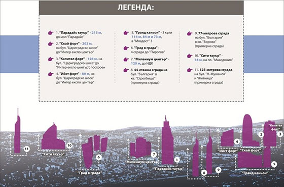 Проектите са на различен етап – някои са почти готови, други се строят или имат разрешително, минали са през одобрение от Столичния общински съвет или пък са все още само намерения. Кулите ще стърчат на различни места в столицата – на бул. “Цариградско шосе”, в широкия център, в кварталите “Лозенец”, “Хладилника”, “Борово”, “Младост” и други.