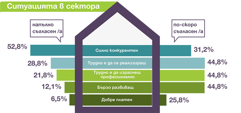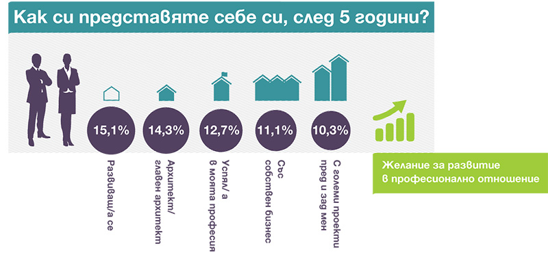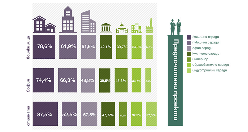 Повече от половината архитекти у нас смятат, че секторът е силно конкурентен, а сред мотиваторите им за работа са: интересните проекти, екипната работа, креативността и възможността за развитие. Висок е процентът на предпочитани проекти – той се концентрира около жилищните проекти – 78.6% Интересен също е фактът, че интериорните проекти изпреварват в предпочитанията образователните и културни сгради. Желанието за работа по интериорни проекти в София е много по-изразено от това в страната с близо 17.8% процента разлика. Опазване на културното наследство и образованието са области, които привличат повече интереса на архитектите в страната, отколкото на тези в София.