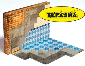 Изпълнението на цялостната хидроизолационна система за бани и мокри помещения на „Теразид” започва с нанасянето на 2 или 3 слоя от пастообразната хидроизолация Теразид GT-11. Продуктът се отличава с отлична адхезия към различни строителни основи: бетон, циментопясъчни замазки, вароциментови мазилки, етернитови и плоскости от гипскартон и други. За да се гарантира пълна водонепропускливост към съседни или долни стаи и помещения, е желателно хидроизолацията да бъде нанесена и върху стените на банята или мокрото помещение на най-малко 20-30 см от пода. След полагането на първия слой хидроизолация в ъглите се влага с леко притискане еластичната уплътнителна лента за хидроизолация „ТЕРАЗИД”. Следва повторно нанасяне на пастообразната хидроизолация. Макар че използването на специални уплътнителни ленти за оформяне на ъглите все още не е широко разпространено, поставянето им гарантира качествена хидроизолация дори при слягане на сградите или навлизане на вода между теракотните или фаянсовите плочи.