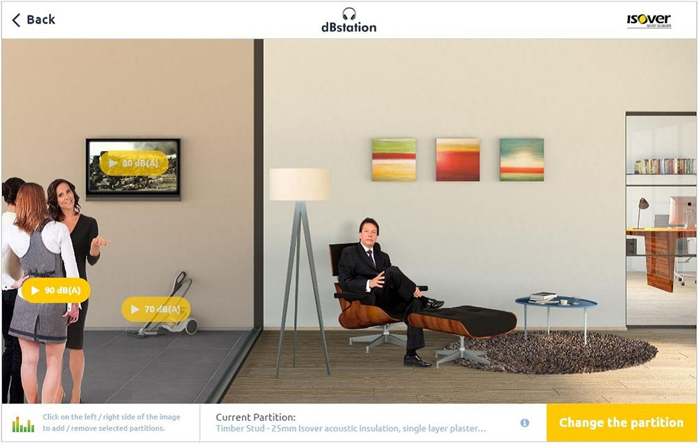 Приложението dBstation от Isover е чудесно средство, което помага да се илюстрира значителната разлика, която акустичните разделителни стени постигат и как спомагат за комфорта на собствениците.