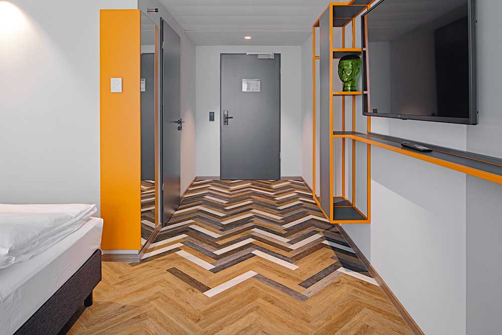 Стаите са с пет различни декора от колекцията „Рибена кост“ на Project Floors. Основната зона е доминирана от топлия дървесен тон на „PW 3065/HB“. Входната зона на стаите и апартаментите е с много по-жив дизайн. Тук различните декори изглеждат необуздано смесени и създават поразителен дизайн. Обзавеждането на стаите е предимно в нюанси на сиво и кафяво, които са преплетени с оранжеви акценти. Те вдъхват живот на практичния дизайн, който е съобразен с нуждите на младите гости, и интегрират корпоративния цвят на хотелите Loginn. Висококачествената подова настилка съчетава индивидуалност и модерен дизайн с уют. Перфектни условия за приятен и вдъхновяващ престой.