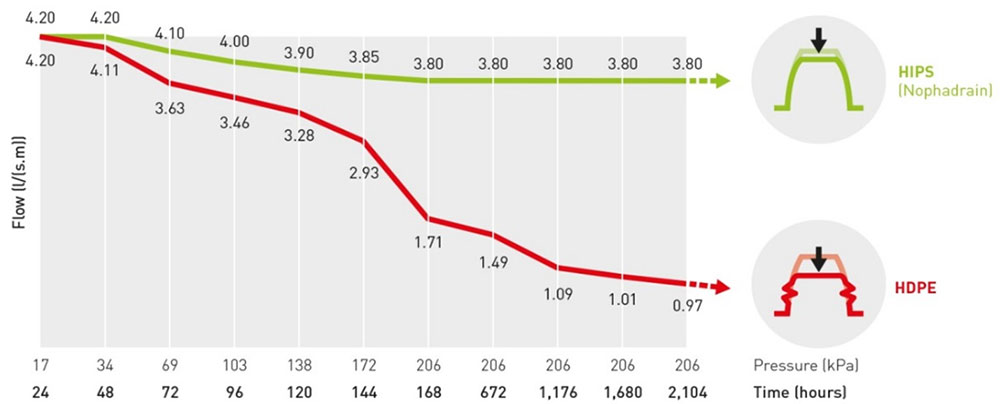 Дренажните мембрани от полиетилен (HDPE) деформират лесно и бързо при продължително натоварване. Това означава, че те не могат да осигурят постоянен дренажен капацитет във времето и ефективността и функциалността им са ограничени. Затова дренажните композити Nophadrain се произвеждат от високоякостен полистирен (HIPS), който има отлични показатели за якост на натиск и химическа устойчивост.