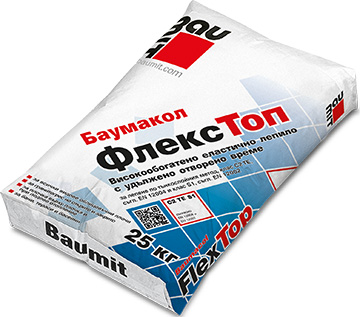Баумакол ФлексТоп е висококачествено, еластично строително лепило с клас C2TE S1. Освен стандартните плочки с него успешно могат да се лепят голямоформатни плочи (до 60 см х 60 см) и плочи от естествен камък, чиято лепилна повърхност е достатъчно равна. По отношение на основата, това лепило се използва за залепване на нови върху стари плочки (плочка върху плочка). То е често прилаган продукт при по-тежко натоварени в експлоатационно отношение помещения: за подове в магазини, хотели, заведения, обществени сгради, за подове с инсталирано подово отопление, както и при облицоването на басейни.