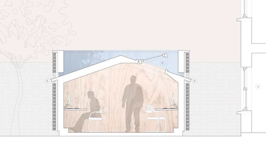 Според архитектите, този офис може да служи като „портал“ в тих, спокоен и фокусиран свят. Намира се в сградата на изоставена оранжерия, от бившия дизайн е останал само наклонен покрив с големи прозорци.