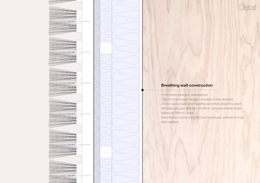 Ефектът е постигнат благодарение на стотиците четки, направени от кокосово влакно. В същото време, за да се постигне илюзията за безшевна повърхност, входната врата е прикрита. Стените са покрити с бял шперплат, офисът е изолиран от шума с помощта на слой от овча вълна. Пространството е предназначено за 2-ма души. Според авторите на проекта, работните места се подреждат така, че работниците да седят гръб към гръб.