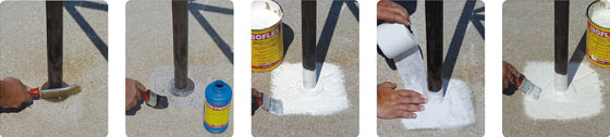 На труднодостъпни местата, където има метални конструкции (парапети, тръби и др.) основата трябва да е почистена от прах и ръжда. Сухата повърхност около металните елементи се грундира с ISO-PRIMER. Нанася се един слой ISOFLEX и докато е все още пресен се полага армировъчна стъклофибърна или полиестерна лента TREVIRA. След като първия слой ISOFLEX изсъхне се нанасят още два локални слоя.