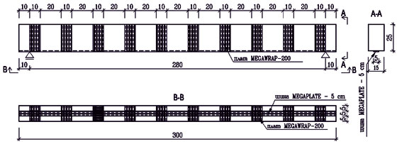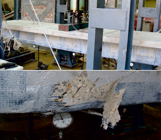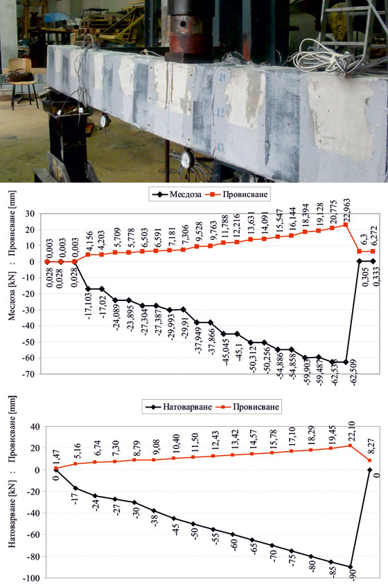 Опитният образец преди усилване се подлага на циклично променливо натоварване в продължение на 2 х106 цикъла, след което при липса на видимо нарушение на носимоспособността на гредата се извършва статично натоварване на стъпки до разрушаване. Разрушената греда се усилва по системата за цялостно усилване с композитни материали. Усилването в опънната зона на гредата се осъществява посредством карбонова лента MEGAPLATE, залепена с епоксидна паста EPOMAX-PL. В напречна посока, във вид на стремена се поставят ивици от карбонов плат MEGAWRAP-200 залепени с епоксидна смола EPOMAX-LD. Така усилената греда отново се натоварва на циклично променливо натоварване. При достигане на 40000 цикъла не се наблюдават видими нарушения в усилването. След циклично натоварване се извършва статично натоварване на стъпки до разрушаване. На базата на получените резултати се установява 44% увеличение на носимоспособността на усилената греда. Усилването с MEGAWRAP-200 и MEGAPLATE дава възможност за увеличаване на експлоатационния живот на елемента и може да се използва за конструктивни елементи подложени на циклично променливи натоварвания.