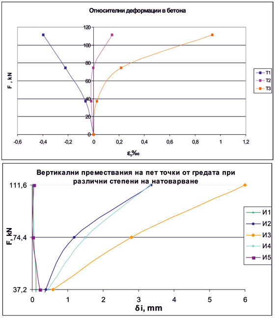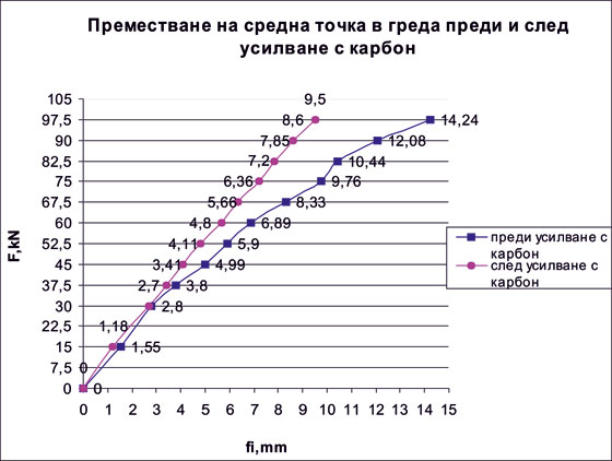 При поставения проблем и в търсенето на адекватни и съвременни решения е подготвен и проведен експеримент за изследване възможността за усилване на дефектирала греда с плочогредово сечение с MEGAWRAP-200. Натоварването се осъществява посредством хидравлична преса създаваща статично натоварване. Преди структурно усилване с карбон, първата пукнатина (нормална) се появява при сила 37,5 kN, а недопустима пукнатина при 97,5 kN. При 105 kN настъпва разрушаване на гредата. Дефектиралата греда се усилва с MEGAWRAP-200 и EPOMAX-LD, по метода за усилване с композитни материали и се натоварва отново. При натоварване със сила до 52,2 kN се наблюдава преобладаваща еластична работа на елемента. При 112,5 kN се появява вертикална пукнатина в карбоновото стреме, а при 120 kN настъпва разрушаване. На базата на направените изследвания се достигна до заключение, че усилването с карбонови нишки стабилизира дефектиралия елемент и гарантира еластичната му работа. При монолитни стоманобетонови елементи работещи на огъване, следва да се отчита достатъчно точно съдействащата широчина на плочата и се препоръчва при усилване с карбон в опънната зона, обвиването с MEGAWRAP-200 да се реализира в зоната на наличната армировка.