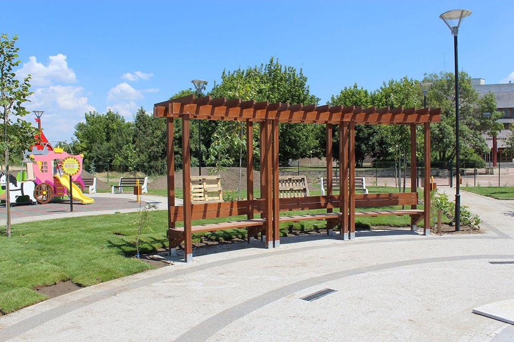 Естествените цветове светло сиво и антрацит, подчертани от дискретния отблясък на специално подбраните фракции от естествен камък на повърхността на изделията подсилват усещането за близост с природата. За оформяне на пътеките около беседките са използвани уникалните плочи Shade. Сиво-сините нюанси на специфичната структурна повърхност кореспондират хармонично с тревния килим, като едновременно с това специалната геометрична форма, прави плочите подходящо атрактивно решение за подреждане на плочо-пътеки на “широка тревна фуга”, с цел осигуряване на по-висок процент озеленяване.