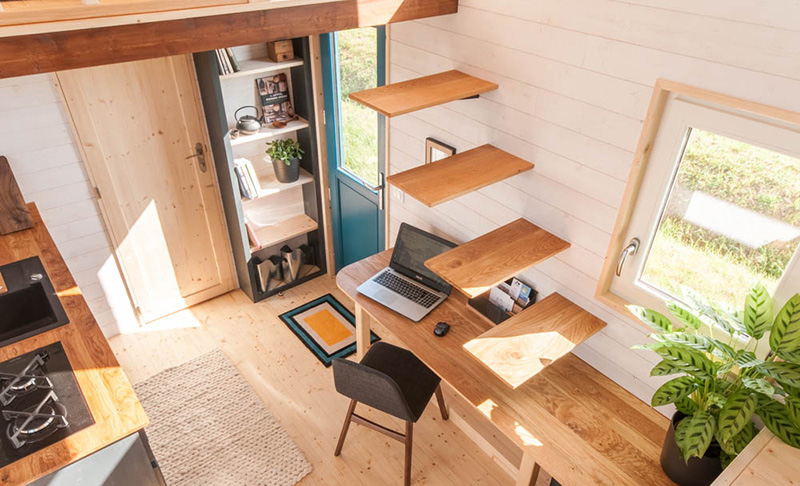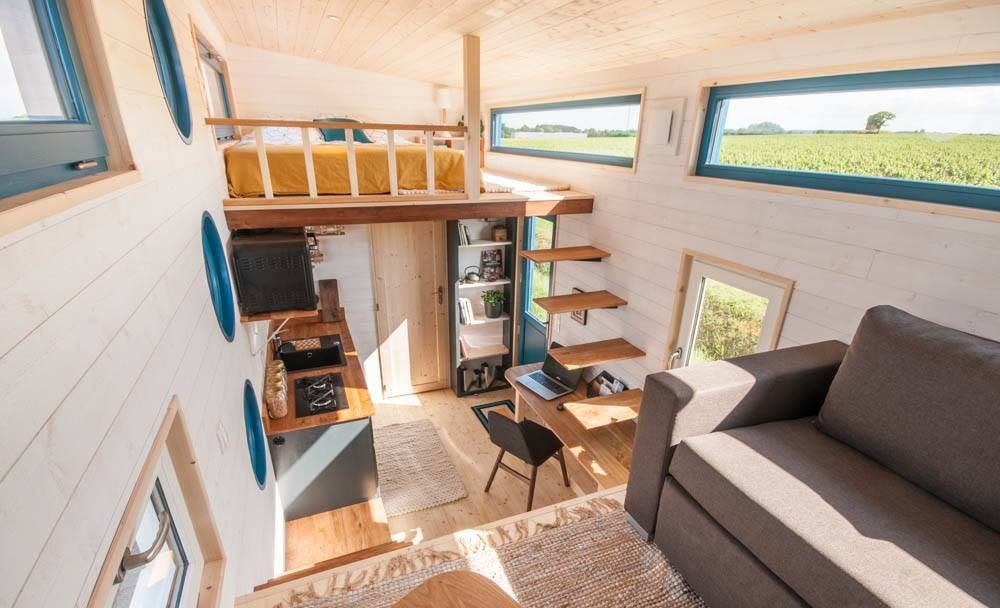 Къщичката е разделена на две половини, между които са входната врата, кухнята, работното място, стълбите към родителската спалня и дневният кът. Точно под него е спалнята на детето, а тази на родителите е отсреща. Домът на колела разполага още със санитарен възел, в който има душ кабина, тоалетна и умивалник. Вътре е много светло, благодарение на умелото разполагане на прозорците.
