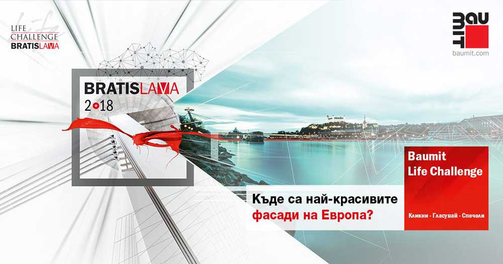 За трети път Баумит търси най-красивата фасада, изпълнена с негови продукти в Европа. Можете вече да гласувате за вашите фаворити в конкурса Baumit Life Challenge 2018, финалът на който ще се проведе в предишната победителка Братислава на 14 юни 2018 г. Авторитетно жури от международни експерти и архитекти ще оценява най-добрите фасадни проекти с Баумит от всичките 27 страни участници.