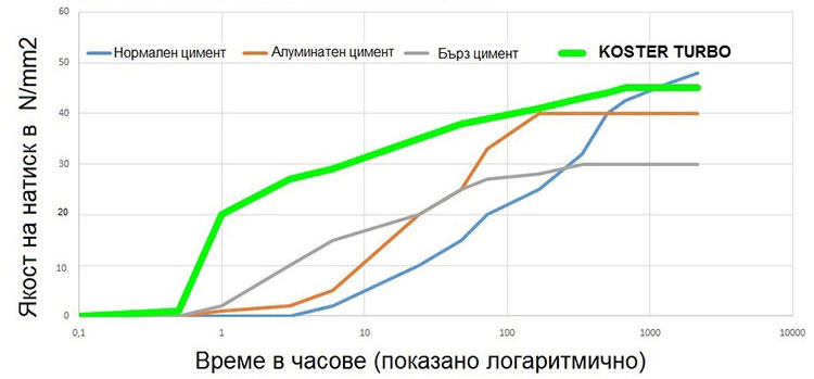 Турбо-системата Кьостер може да издържа леки механични натоварвания още след 30 минути (10 N/mm²)  и високи натоварвания (>20 N/mm²) след 60 мин. Освен бързото набиране на якост, Турбо-продуктите Кьостер притежават отворено време за работа 15 минути и с тях се работи изключително лесно  в сравнение с други подобни продукти на пазара.