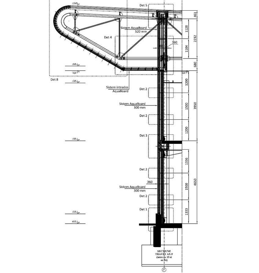 Хоризонталните фуги на нивото на първия етаж бяха направени с хидроизолационни продукти и системи, позволяващи компенсация на изместването (водоустойчива еластична лента и лепило, съвместими с носещата повърхност). Конструкцията на фасадата се поддържа от U-образни метални греди. Важен аспект при фугите беше дифузионното фолио и пароизолацията, монтирани без фуги в сгъната система.
