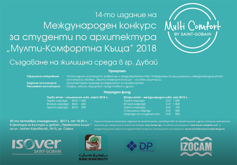На 30-ти октомври (понеделник) 2017 г., в София от 18:30 ч., в Център за култура и дебат „Червената къща” (ул. Любен Каравелов 15) официално ще беде открито 14-тото поредно издание на конкурса за студенти по архитектура Сен-Гобен „Мулти-Комфортна Къща“ 2018, на тема: „Създаване на жилищна среда в Дубай“.