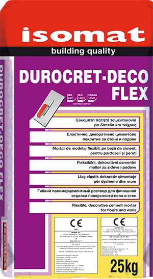 Флексова полимерна микроциментова смес с фибри. Подходящо за вътрешно и външно приложение. Използва се като декоративно покритие върху подове, стени, стълбища и т.н. Подходящо за места където се изисква висока еластичност, като гипсокартон или циментови плоскости, подове със системи за подово отопление и др. Не се нуждае от допълнително усилване с полимерни добавки. DUROCRET-DECO FLEX се предлага в 6 готови цвята (бял, сив, светло сив, светла охра, мока, крокус). Също така може да се оцветява с висококачествени неорганични пигменти DECO COLOR.