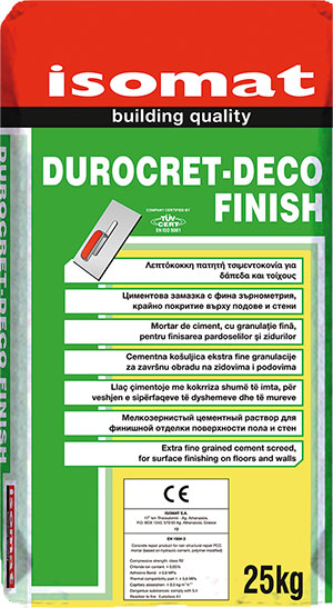 Полимерна микроциментова смес с фина зърнометрия. Образува гладка крайна повърхност. Притежава много добра водонепропускливост и адхезия към основата. Полага се на малка дебелина (1-3 mm), като крайно покритие върху циментови основи на различни места, като стълбища, подове, стени и за специални конструкции, като умивалници, вани, душове и т.н. DUROCRET-DECO FINISH се предлага в 6 готови цвята (бял, сив, светло сив, светла охра, мока, крокус). Също така може да се оцветява с висококачествени неорганични пигменти DECO COLOR.
