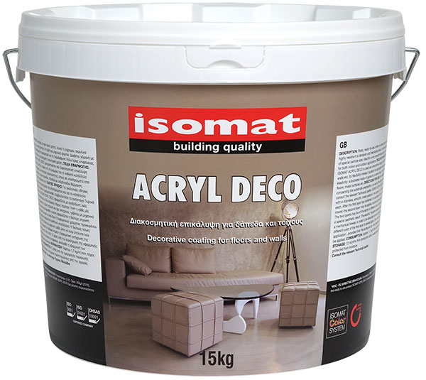 Пастообразно готово за употреба бяло или цветно акрилно покритие. Има висока еластичност и устойчивост на механични натоварвания и износване. Подходящ за полагане вътрешно и външно на места, където се изисква висока еластичност: основи от гипсокартон, подове със системи за подово отопление и т.н. ISOMAT ACRYL DECO се предлага в бял и избрани цветове по ISOMAT COLOR SYSTEM.