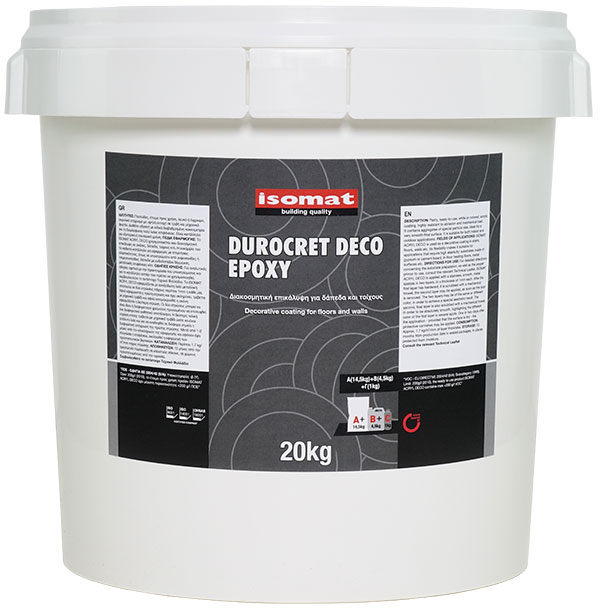 Трикомпонентно цименто-епоксидно покритие с високи механични якости и износоустойчивост. Образува гладка крайна повърхност със специален естетически вид, подходящо за вътрешно и външно приложение върху стени и подове. DUROCRET-DECO EPOXY се предлага в бял и сив цвят.