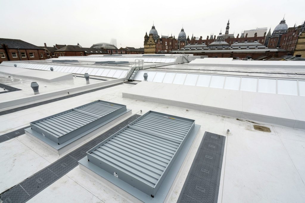 Първоначалният проект предвижда съществуващата хидроизолация от филц да бъде отстранена изцяло до металната обшивка на покрива. Това обаче би довело до сериозно разрушаване без гаранция за водонепроницаемост на сградата. Затова строителят Protech Roofing предлага механично закрепена система Sarnafil, която може да бъде положена върху съществуващата основа, при което се гарантира, че пазарът остава отворен.