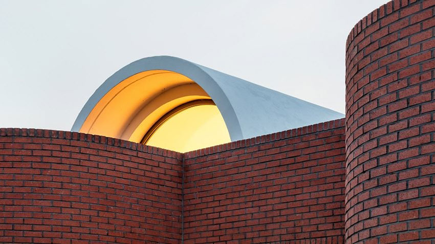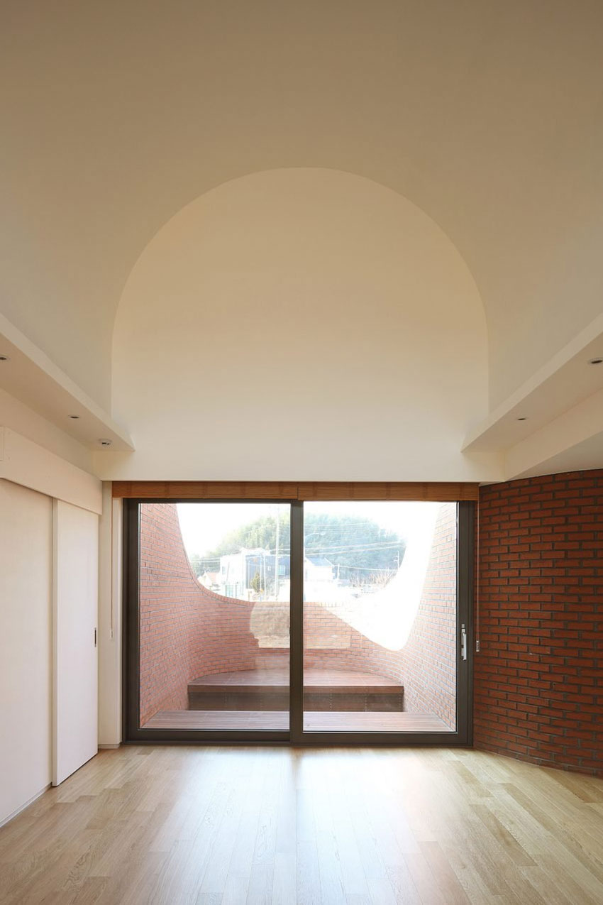 Къщата е обгърната от висока тухлена ограда, която наистина в някои части е част от стените. Това запазва дома от шума и любопитните погледи. Облите форми сякаш обгръщат постройката, но в същото време са достатъчно раздвижени, за да не предизвикват асоциация с крепост. Новият дом на майката разполага с две спални, две стаи за гости и малък двор, към който се излиза от дневната.