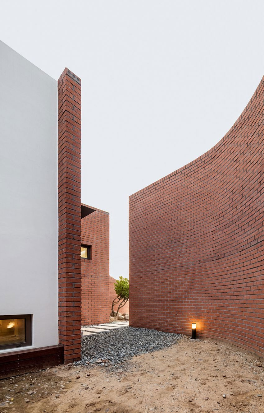 Стената, която заобикаля градината, обърната към север, се спуска надолу, за да може в далечината да се видят планините на остров Бипари. Тухлената облицовка продължава около ъгъла на жилището, за да подчертае връзката между закрито и открито пространство.