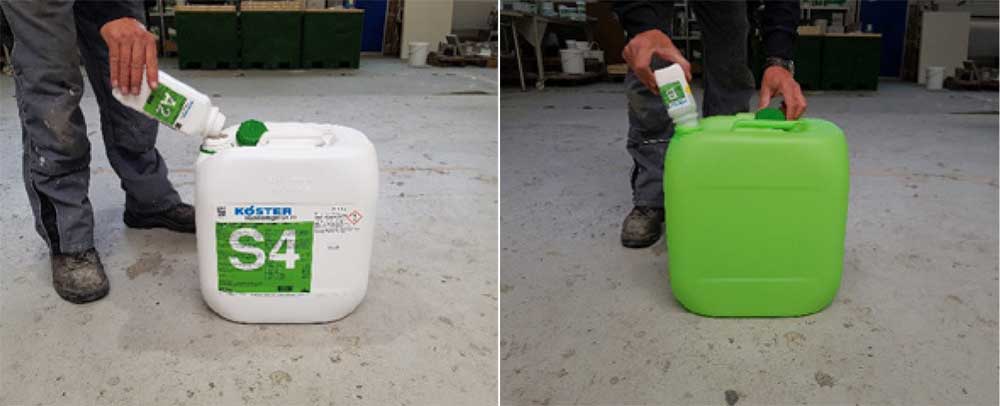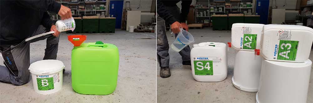 Ако се добави Компонент В, стандартната смес от компонентите на Кьостер S4 ще има приблизително реакционно време от 40 секунди. За да постигнете това време, Комп. А2 (1 кг) се добавя в А1 съда (20 л), затваря се и се смесва чрез разклащане на контейнера в продължение на 3 минути. Солта, Компонент В се изсипва в празния зелен съд и се смесва с 10 л вода.