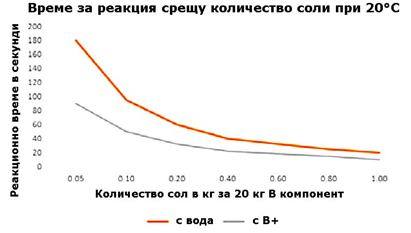 Времето за реакция на сместа може да варира в зависимост от включените в нея компоненти. Времето за реакция (на гела) може да се предвиди приблизително с помощта на диаграмата, показана по-долу. Както се вижда, смесването на синтетичната смола на Компонент В води почти до удвояване на реакционното време.
