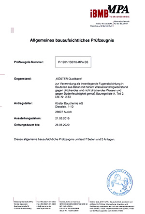 Кьостер Набъбващата лента притежава одобрен Тест-сертификат за строителната промишленост, което означава, че тя е носител на Ü-маркировка, тоест съответства на строителните нормативни изисквания.