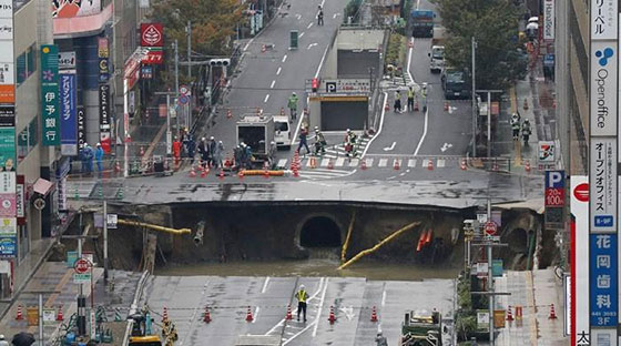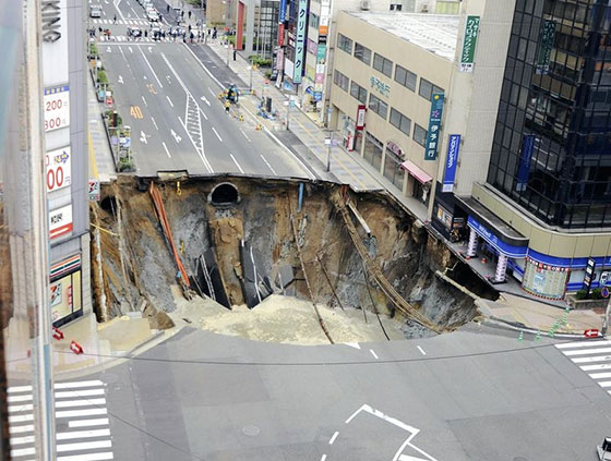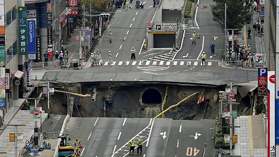 Гигантска дупка се отвори край железопътната гара в японския град Хукуоса, намиращ се в близост до летището. При рухването на настилката са засегнати електрически кабели, което остави без ток магазините и търговските обекти на международния терминал на летището в града.
