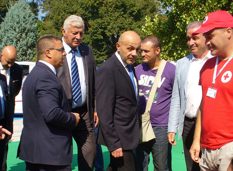Вицепремиерът Дончев (в средата) заедно с областния управител на Пловдивска област Здравко Димитров и директора на Областната дирекция на МВР в Пловдив старши комисар Атанас Илков (вляво от него) наблюдават демонстрация от кампанията за безопасно движение „Отговорни на пътя“. Тя се провежда за първи път в рамките на Есенния панаир.