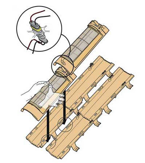 Решениeто е съвсем просто – в керемидите има вградена соларна клетка. Самите керемиди изглеждат нелошо. Направени са от глина, в която е вградена по една соларна клетка, така, че при нареждането да бъде изложена на слънце. Създателите им не казват конкретни цифри за капацитета на соларните керемиди, но посочват, че добивът на енергия е толкова висок, колкото при класически фотоволтаични панели, тъй като малкият размер не накърнява ефективността.