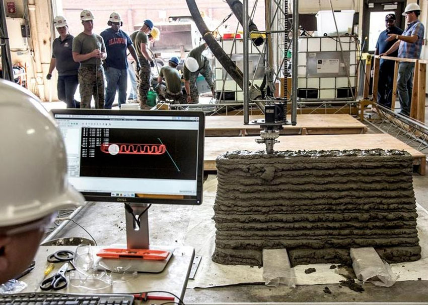 Новите 3D принтери могат да използват налични местни материали, като пясък, чакъл и други подобни фракции за отпечатване на бетонни конструкции.