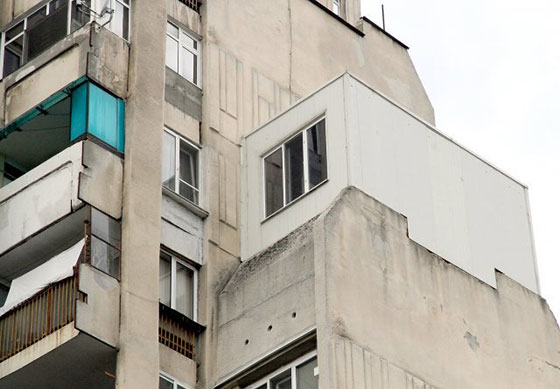 Фургонът е поставен над метална скара на терасата на долния етаж. Той е залепен към спалнята на 28-и апартамент и между двете помещения е избита врата. Сградата на блока е стъпаловидна и така допълнителното помещение е изградено на място, на което преди не е имало нищо.