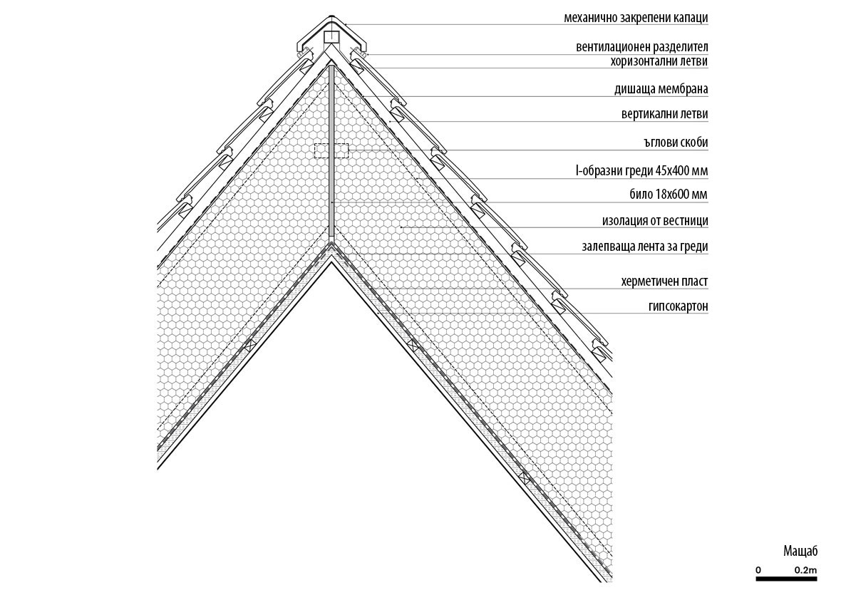 Дизайнът на покрива от пръв поглед изглежда малко нервен. Изграден е от напречни I-образни греди, изработени от OSB дъски с фланци и изпълнени с Warmcel, целулозна изолация, произведена от рециклирани вестници. Херметичният пласт е възпроизведен като слепени OSB3 плоскости. В някои участъци се слагат и паропропускливи мембрани.