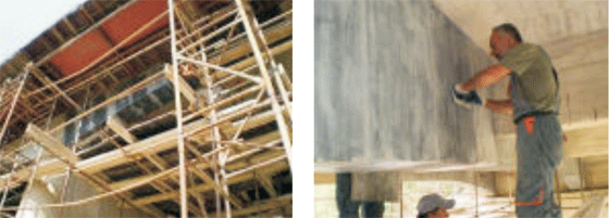 – цименто-полимерни смеси MEGACRET-10 и MEGACRET-40 с якост на натиск /след 28 дни/ Sc = 50-55 MPa и епоксидната смола EPOMAX-EK с еластичен модул Em= 12 600 МPa за репрофилиране на повърхността на усилваните елементи.