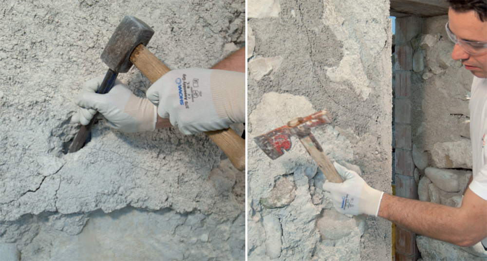 Дефектните, кухите и недобре закрепените части на мазилката трябва да бъдат напълно отстранени. При паметници на културата това трябва да се извърши след предварителна консултация. Ако е необходимо да бъдат запазени, то трябва да бъдат професионално укрепени/запълнени. Почистване на фугите на дълбочина около 2 cm. Отпадъчният материал се отстранява от обекта. Влажна зидария се оставя да изсъхне.