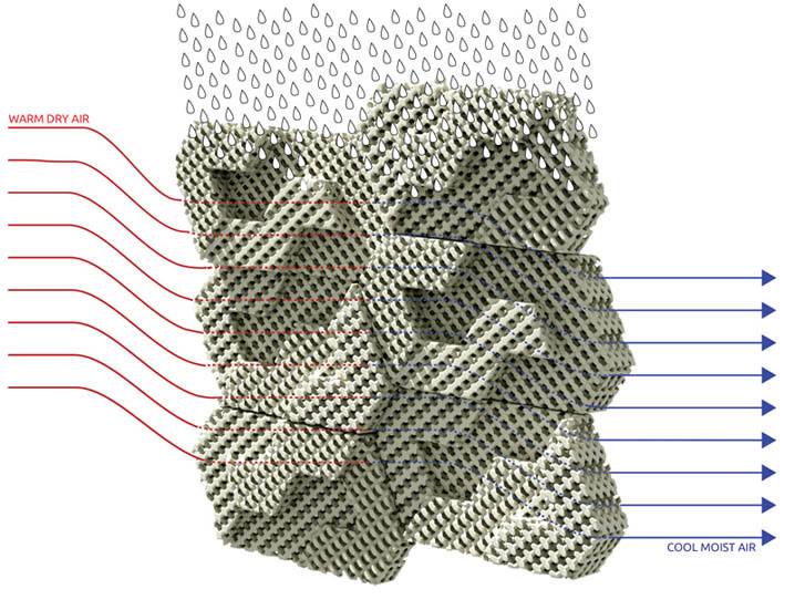 И така, какво точно е Cool Brick? Това е система от 3D принтирани порьозни керамични тухли, поставени в хоросан. Всяка отделна тухла е отпечатана с триизмерен решетъчен мотив, създавайки мрежа от микропори, в която може да се улови влага. Топлият въздух се движи през всяка тухла, в мрежата от малки дупки, загрявайки водата във всяка от порите. Тъй като водата се нагрява, тя се изпарява, охлажда въздуха и при този процес понижава температурата на сградата.