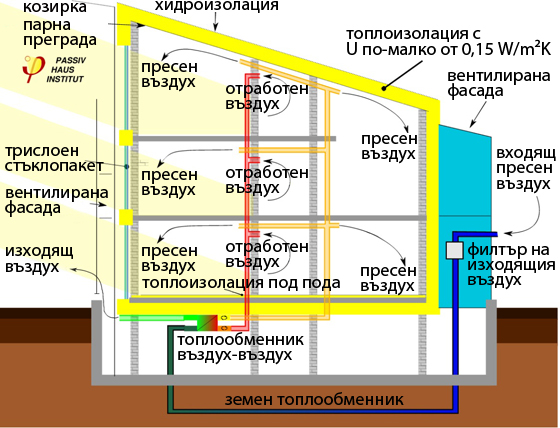 Типичната пасивна къща притежава посочените в графиката конструктивни белези. Отклонения са допустими и възможни на всяко от посочените места, до толкова колкото посоченият принцип на функциониране не е нарушен.