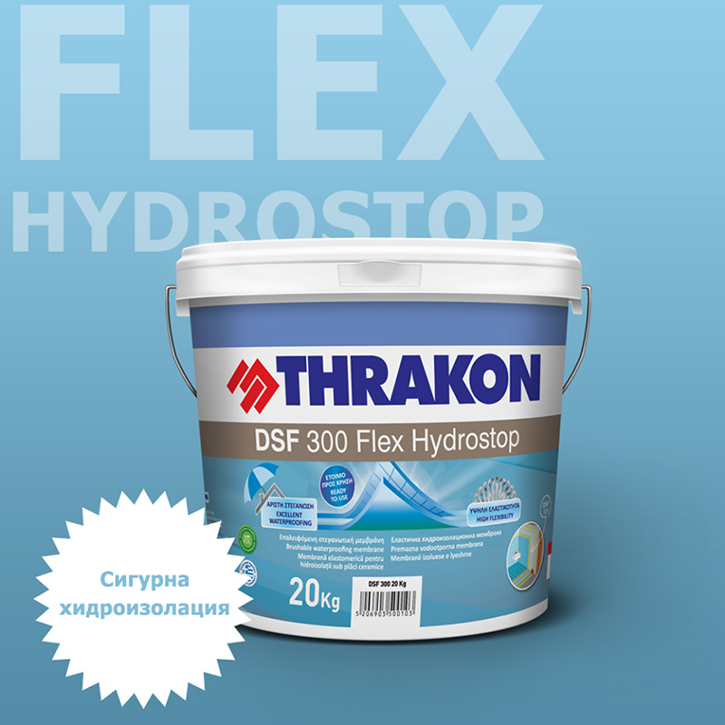 DSF 300 Flex Hydrostop е готова за употреба, еластична, пастообразна хидроизолационна мембрана за тераси, балкони и мокри помещения. За безшевна и безфугова хидроизолация на хоризонтални и вертикални повърхности преди полагане на подова и стенна керамика. За вътрешна и външна употреба върху всички сухи и здрави минерални мазилки, подови замазки, плоскости от гипсокартон и други минерални основи. Изисква предварително грундиране с Thrakon акрилен грунд DSF 305.