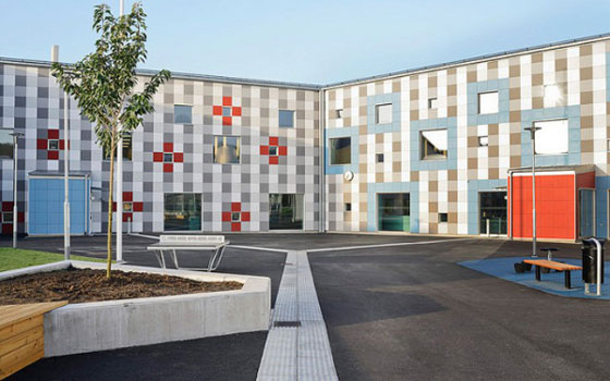 Архитекти започнали проекта чрез добавянето на нов сграден модул със смесено предназначение към вече съществуващия образователен център, който побира до 360 ученици. Пристройката на Коласколан е построена като допълнение към съществуващата сграда и е на стратегическо място, за да се създаде един просторен, открит училищен двор. Пъстроцветни плоскости от фиброцимент покриват фасадата на училището, създавайки жизнерадостна, игрива физиономия. Дворът е новото сърце на училището и не само осигурява връзка между новата и старата сгради, но също така създава открита творческа среда за учениците и преподавателите.