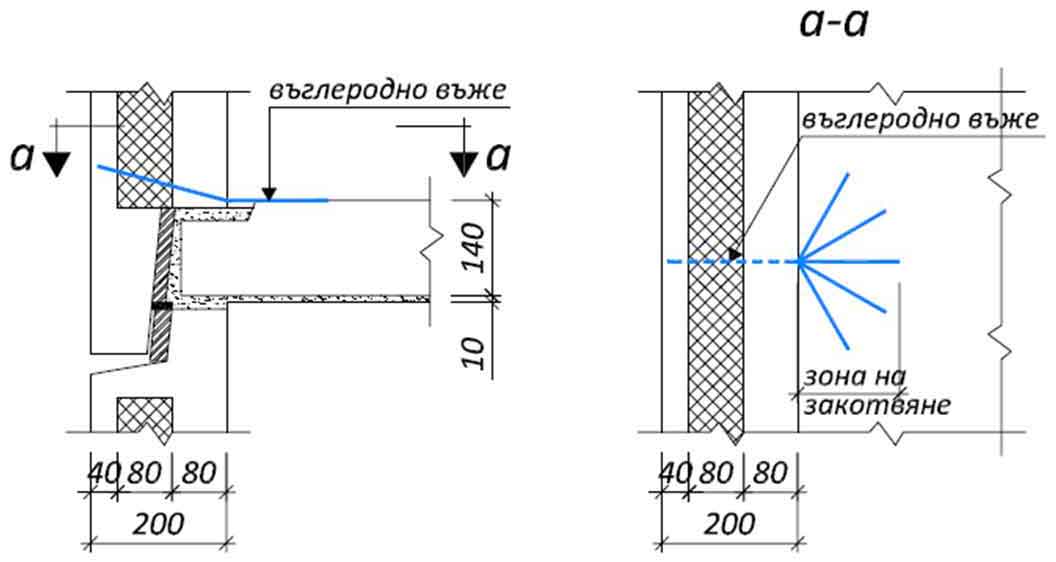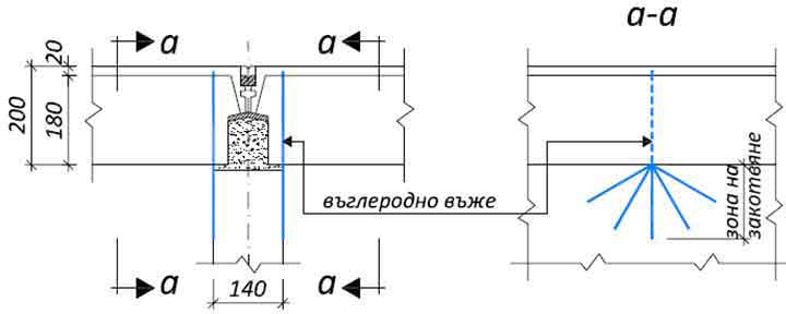 5. Усилване на хоризонталните връзки (чрез добавяне на нови такива) чрез монтиране на въглеродно въже SikaWrap® FX-50 C, анкерирано към вертикален стоманобетонен панел и подова панела (звездообразно) – фиг. 10 и фиг. 11.