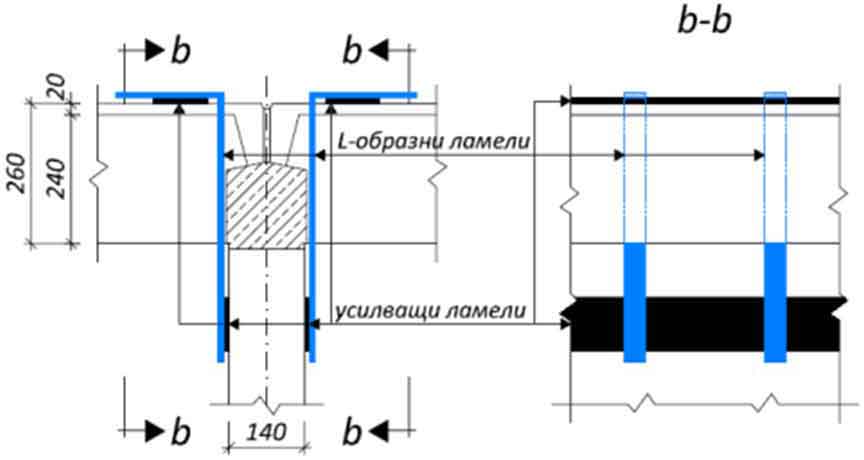 11. Усилване на диафрагмите по калканите и по свързаните с тях надлъжни стоманобетонни панели чрез външно монтиране на вертикални ламели Sika® CarboDur® по цялата височина на сградата. Двустранно монтиране на вертикални ламели Sika® CarboDur® към носещите вътрешни стоманобетонни стени, като следва да се пробият вертикални шлицови отвори на места, различни от местата на хоризонталните връзки между подовите панели и съобразно наличието на съществуващата хоризонтална електрическа инсталация – фиг. 14; даден е и вариант за монтиране на свързващи L-образни ламели Sika® CarboShear® L (през хоризонтални шлицови отвори) – фиг. 14.