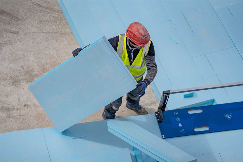В изкопната яма с дълбочина 8 м Hochtief съчетава защита срещу водно налягане с дългосрочна и надеждна топлоизолация. Секция по секция, почвата първо се защитава с бетонен слой. След това се монтират изолационните панели „Ravatherm“ – покривайки общо 3600 м². Това не е проблем за монтажниците: Изолационните панели се полагат свободно, плътно залепени един за друг. Това осигурява бързо развитие на строителството. Накрая се монтира армировката и водоустойчивата бетонна фундаментна плоча.